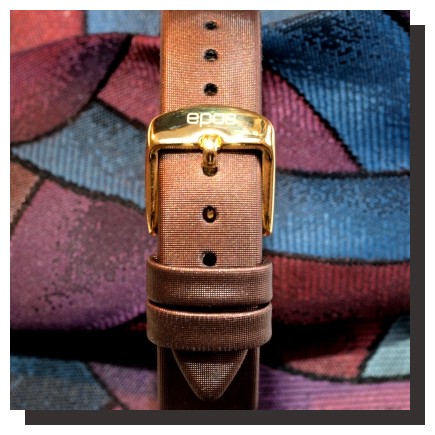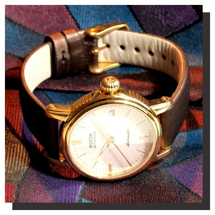 Textilüberzug und eine vergoldete Dornschließe mit EPOS-Gravur. Mit 34 mm Durchmesser ist sie eine recht große Damenuhr.