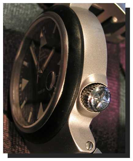 Die riesige versenkte Krone erlaubt ein leichtes Stellen der Uhr.
