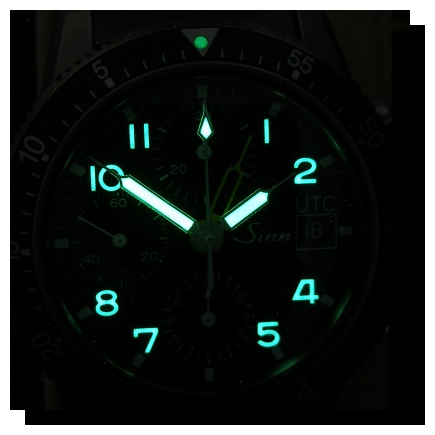 Zeiger und Indizes sind üppig mit Leuchtmasse belegt, selbst der große Sekunden-Stopp-Zeiger trägt