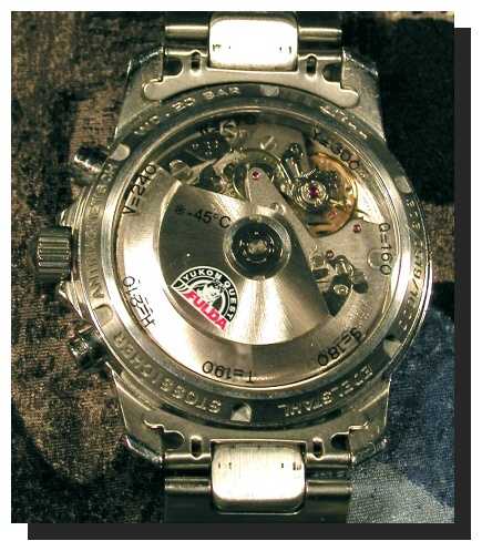 unverzierte Kaliber Valjoux 7750 zu betrachten ist. Auch sie ist bis 200 Meter wasserdicht.