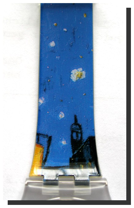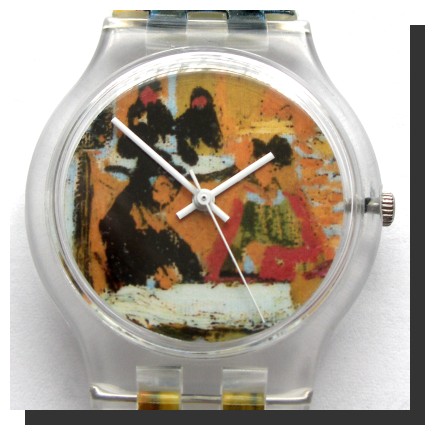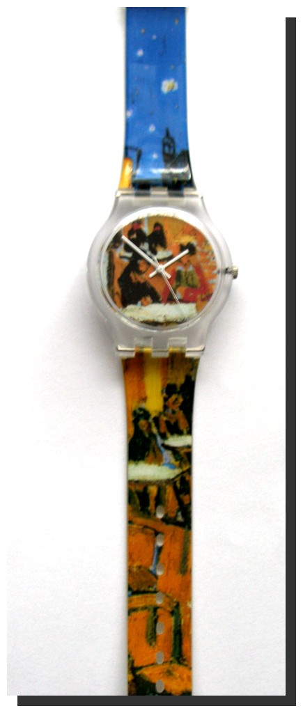 Als Erinnerung an das Kröller-Müller-Museum bei Arnheim im Oktober 2010. Eine bunte Plastikuhr nach dem Vorbild der Swatch-Uhren. Das Motive ist das "Nachtcafe" von Vincent van Gogh.